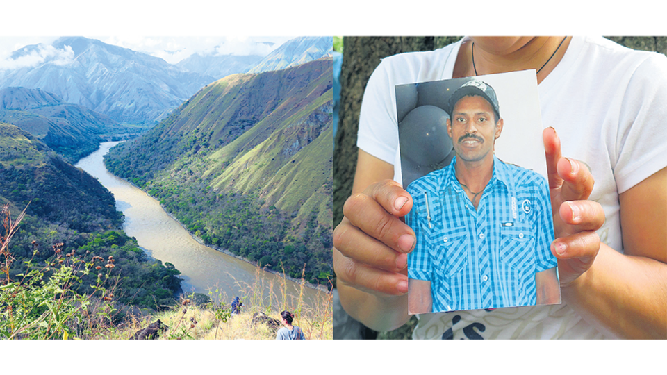 El río Cauca recorre la zona andina de Colombia; un familiar sostiene la foto de un desaparecido en Antioquía.